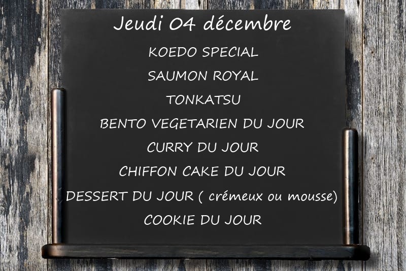 KOEDO SPECIALSAUMON ROYALTONKATSUBENTO VEGETARIEN DU JOUR CURRY DU JOURCHIFFON CAKE DU JOURDESSERT DU JOUR ( crémeux ou mousse)COOKIE DU JOUR