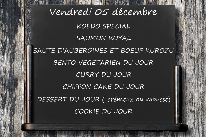 KOEDO SPECIALSAUMON ROYALSAUTE D’AUBERGINES ET BOEUF KUROZUBENTO VEGETARIEN DU JOUR CURRY DU JOURCHIFFON CAKE DU JOURDESSERT DU JOUR ( crémeux ou mousse)COOKIE DU JOUR