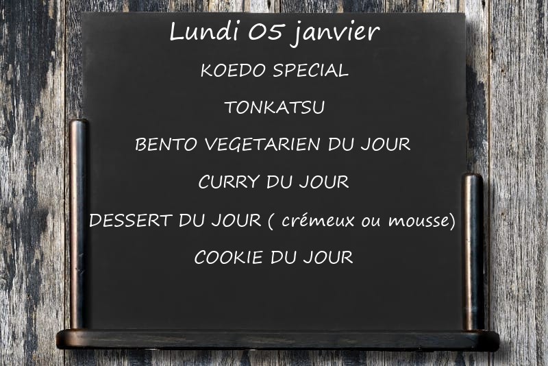 KOEDO SPECIALTONKATSUBENTO VEGETARIEN DU JOUR CURRY DU JOURDESSERT DU JOUR ( crémeux ou mousse)COOKIE DU JOUR