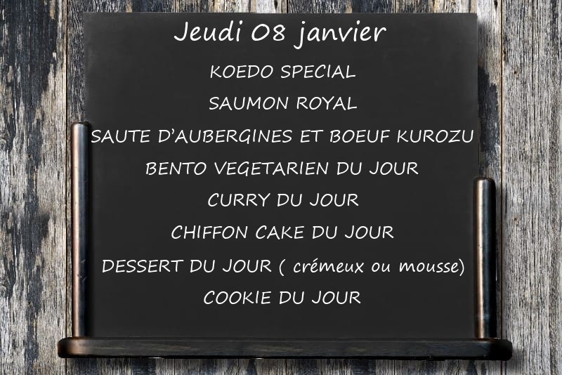 KOEDO SPECIALSAUMON ROYALSAUTE D’AUBERGINES ET BOEUF KUROZUBENTO VEGETARIEN DU JOUR CURRY DU JOURCHIFFON CAKE DU JOURDESSERT DU JOUR ( crémeux ou mousse)COOKIE DU JOUR